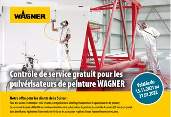For economic and safety reasons, it is a good idea to check paint sprayers periodically. WAGNER service personnel will now check your paint sprayer. This service check (60 min.) Is free. (excluding transport costs) You will also benefit from a 10% discount on any necessary accessories and wearing parts. This offer is valid from November 15,...